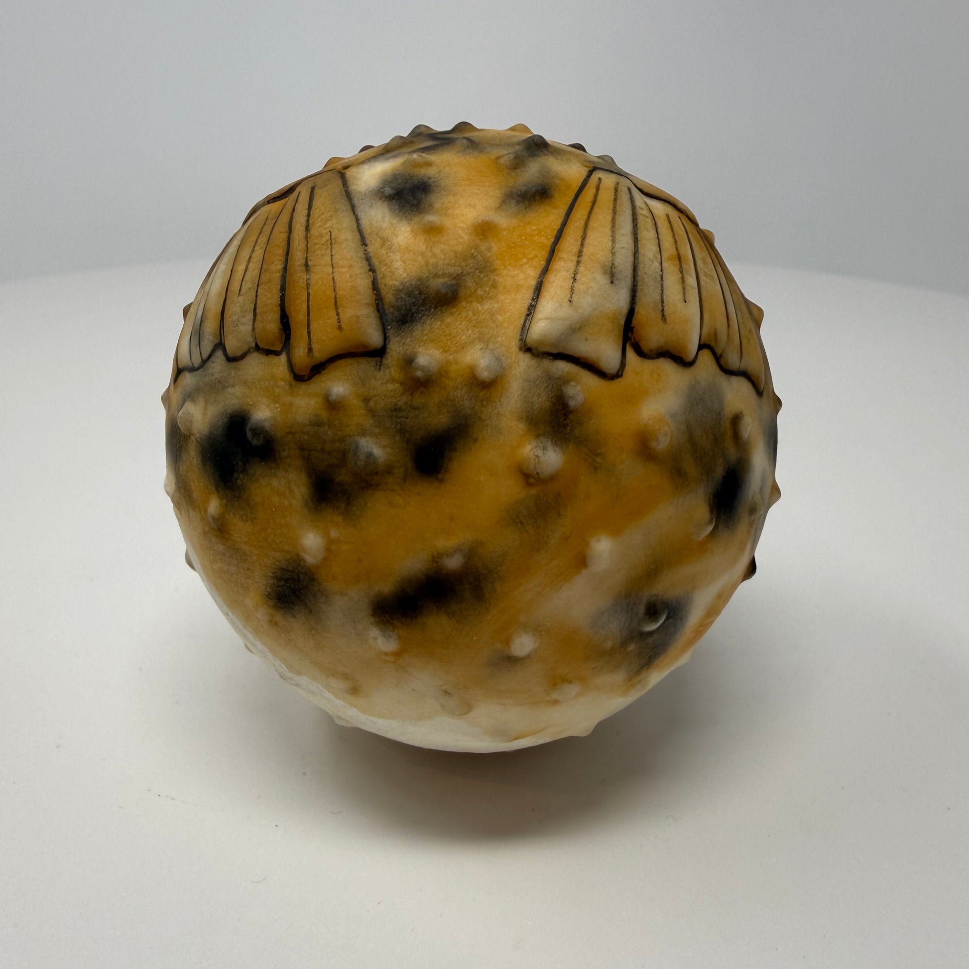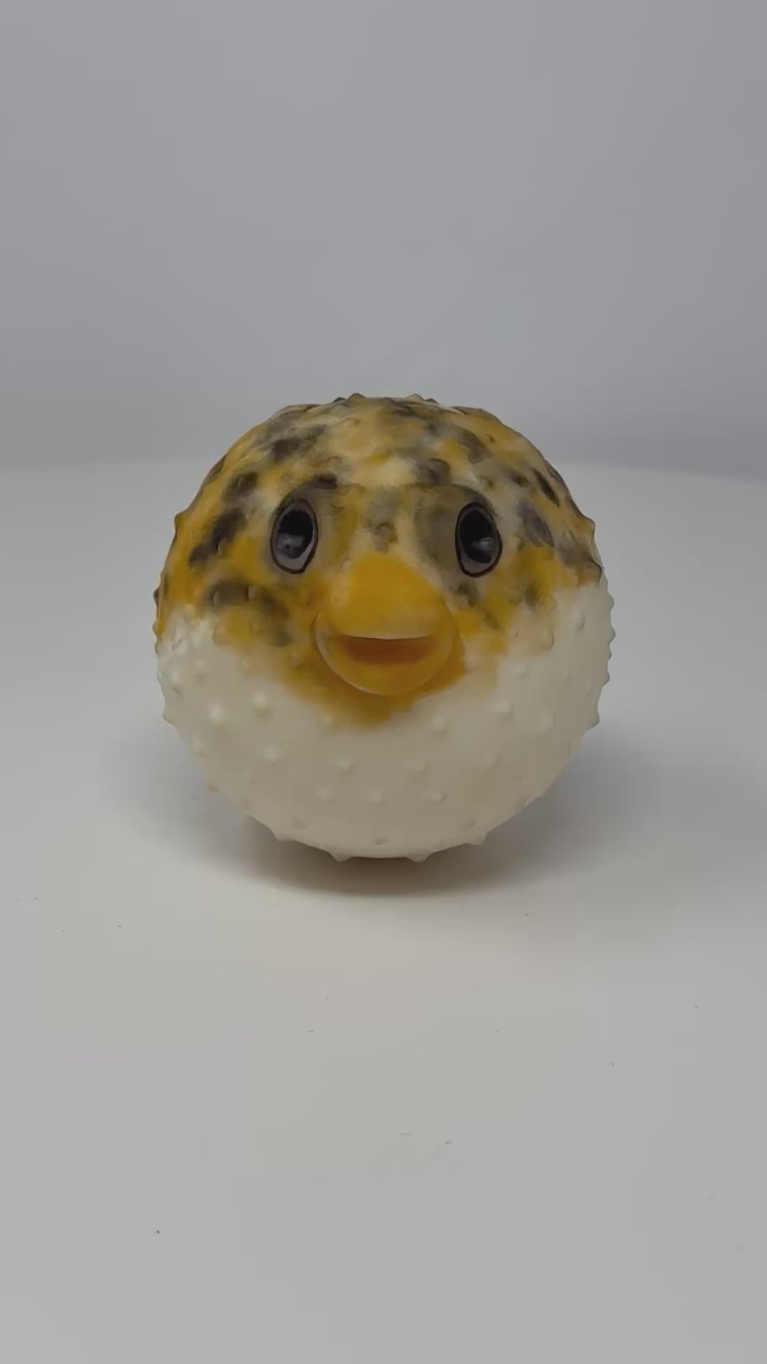 Most pufferfish species live in marine or brackish waters, but several tropical genera, comprising about 35 species, spend their entire lifecycles in fresh water. The puffer fish's unique and distinctive natural defenses help compensate for its slow locomotion. Our Puffer Ball was digitally sculpted, 3D printed, then molded and cast to provide a durable and engaging enrichment. Our replicas are made from strong, food-safe, and impact-resistant materials. These are intrinsically tinted to keep vibrant colors after rigorous use and cleanings. This enrichment play toy is also buoyant, making it easy to retrieve. The Puffer Ball measures 3 inches long. As each enrichment is hand-cast and tinted, color may vary slightly.